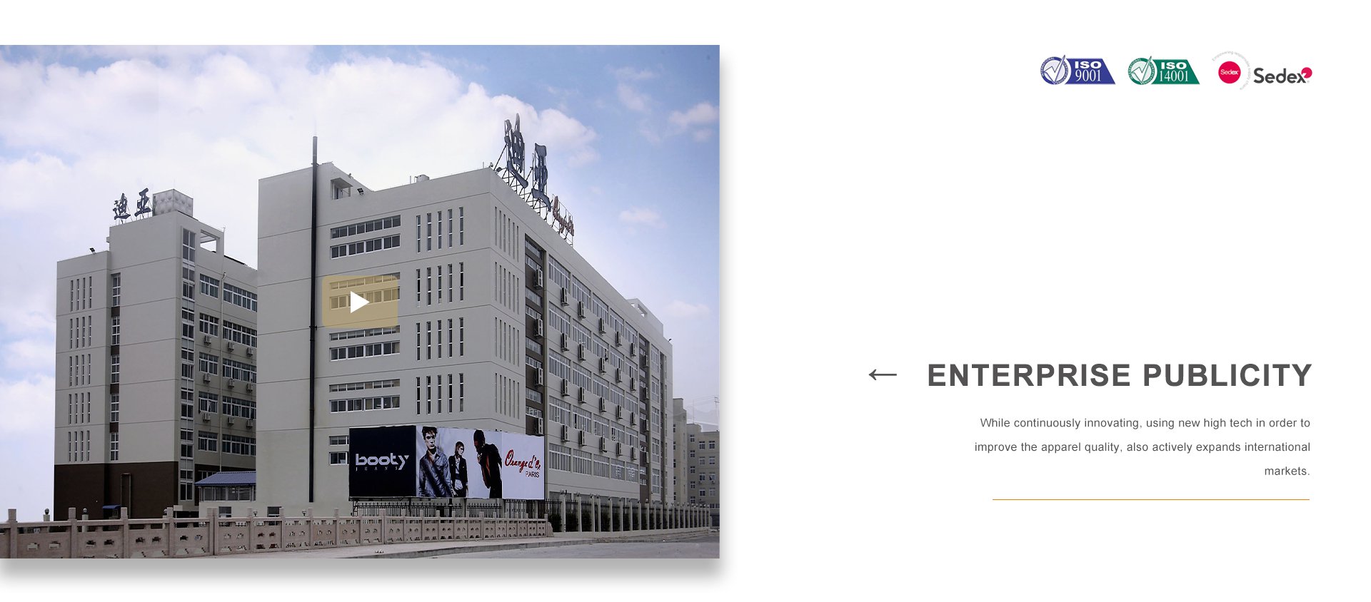 浙江迪亞服飾有限公司于1998年在世界時尚品牌之都——法國巴黎二區應運而生。同年,在浙江省甌海經濟開發區東方南路28號設立服裝制造工廠。公司集服裝設計、生產、營銷、品牌于一體,在不斷創新、采用高新技術提高服飾質量的同時,積極拓展國際市場,海外營銷部長期與LV集團旗下的MAJE、SOEUR、BALIBARIS等國際著名品牌保持非常緊密的合作關系。